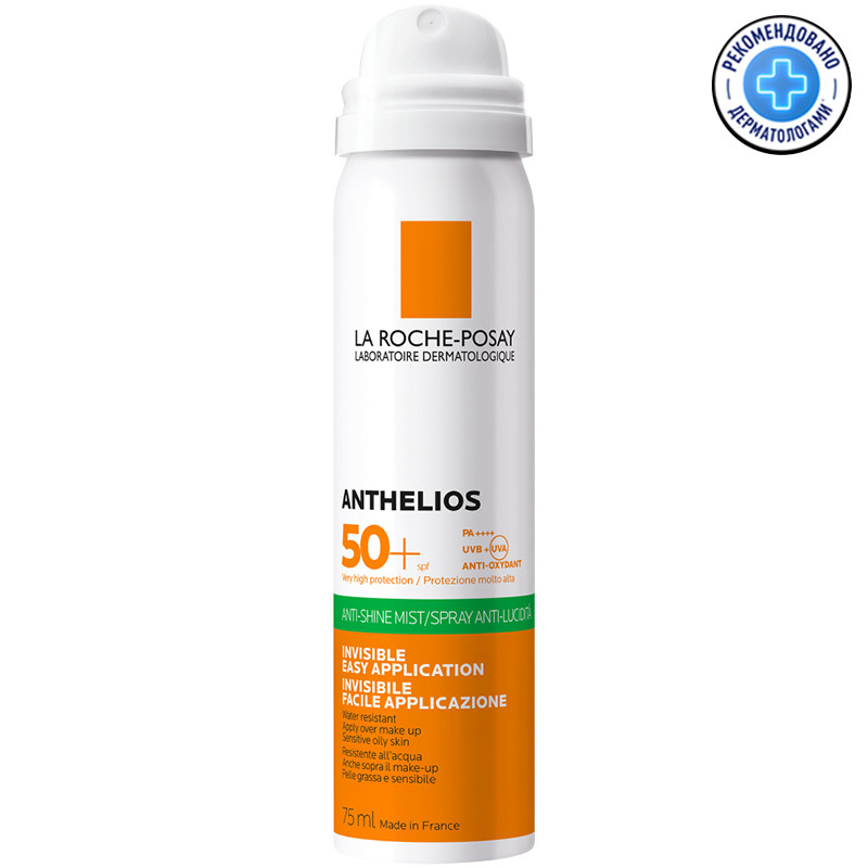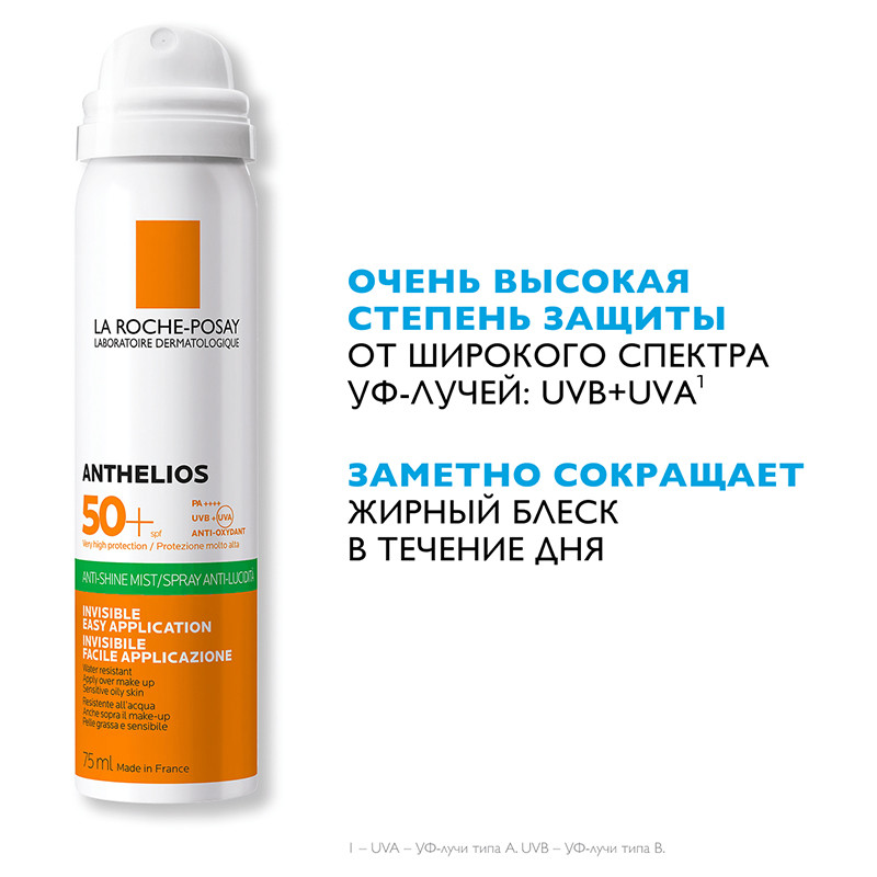 Солнцезащитный матирующий спрей-вуаль для лица La Roshe-Posay Anthelios SPF 50+ для жирной и проблемной кожи.