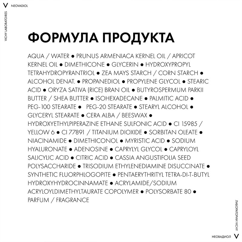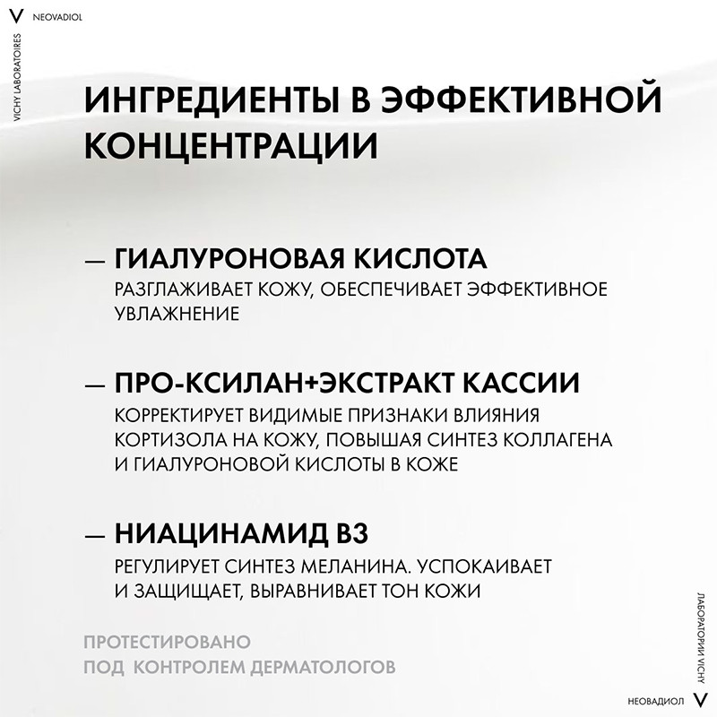 Проксилан, экстракт кассии, ниацинамид, гиалуроновая кислота натурального происхождения, вулканическая вода Vichy.