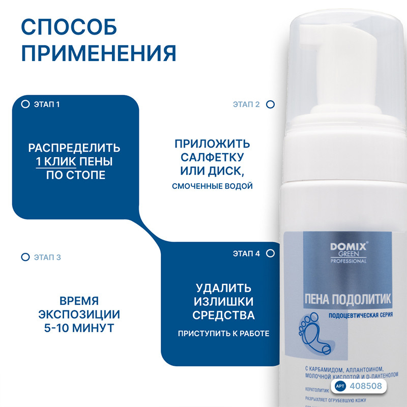 Распределить 1 клик пены по стопе, приложить салфетку или диск, смоченные водой. Через 5-10 минут удалить излишки средства и приступить к обработке. При большой толщине кератоза перед обработкой стопы абразивом можно срезать участки избыточного ороговения.