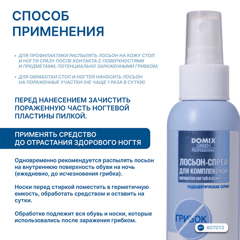 Для профилактики распылять лосьон на кожу стоп и ногти сразу после контакта с поверхностями и предметами, потенциально зараженными грибком.