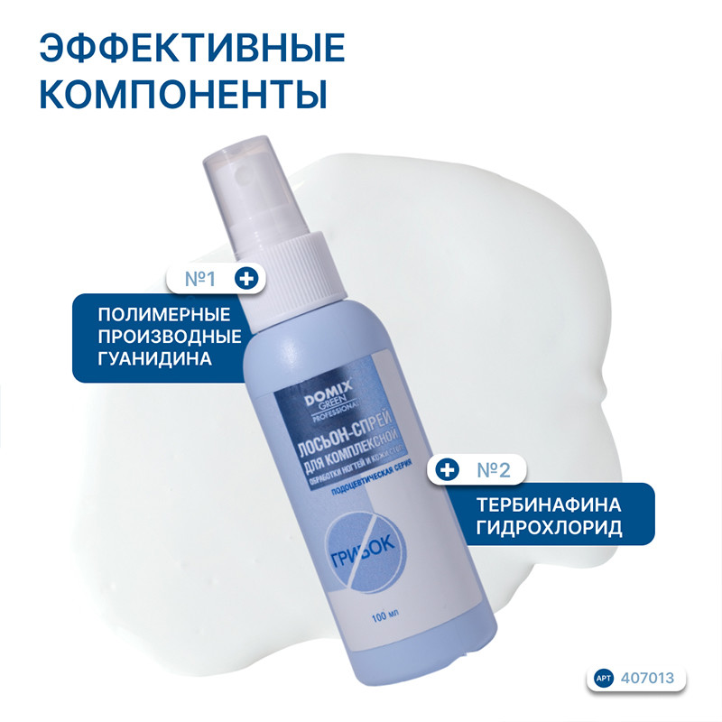 Лосьон-спрей содержит антифунгальный агент тербинафина гидрохлорид. Полимерные производные гуанидина создают на коже и ногтях неосязаемую защитную пленку, исключая доступ воздуха для жизнедеятельности грибка. Обеспечивает защиту при посещении мест общественного пользования. Также применяется для обработки носков и внутренней части обуви. Не оставляет пятен, не портит обувь. Клинически протестировано.