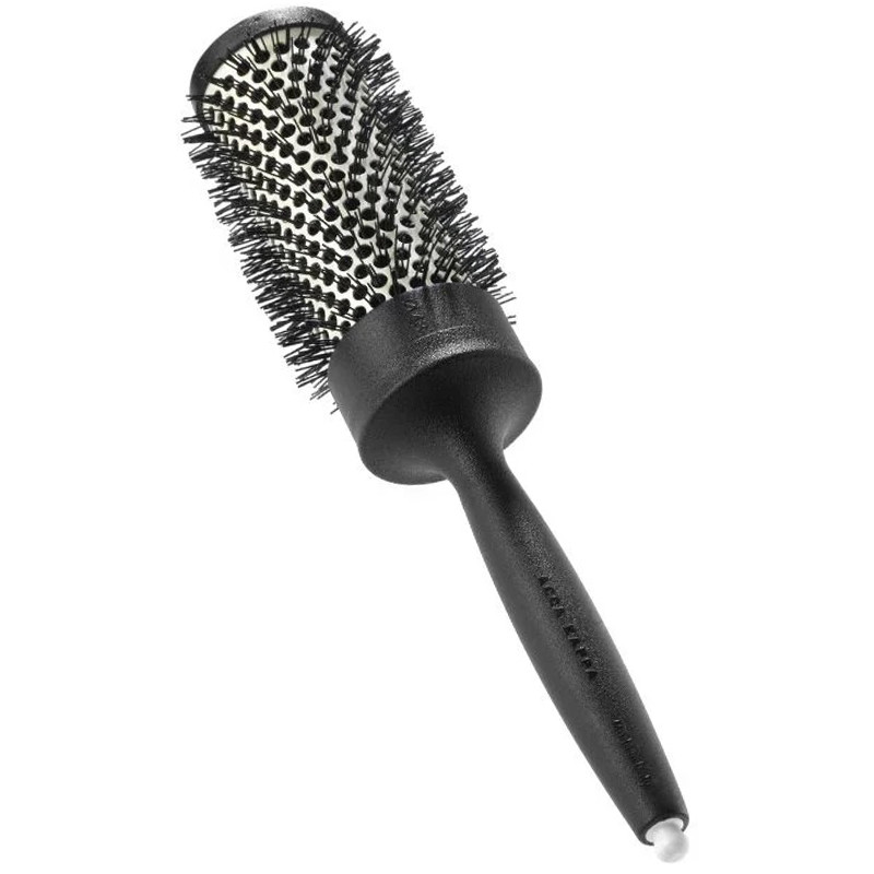 Эргономичная ручка изготовлена из специального материала на основе «углеродного волокна». Алюминиевый корпус покрыт керамикой и турмалином. Нейлоновая щетина с закругленными кончиками устойчива к воздействию фена.