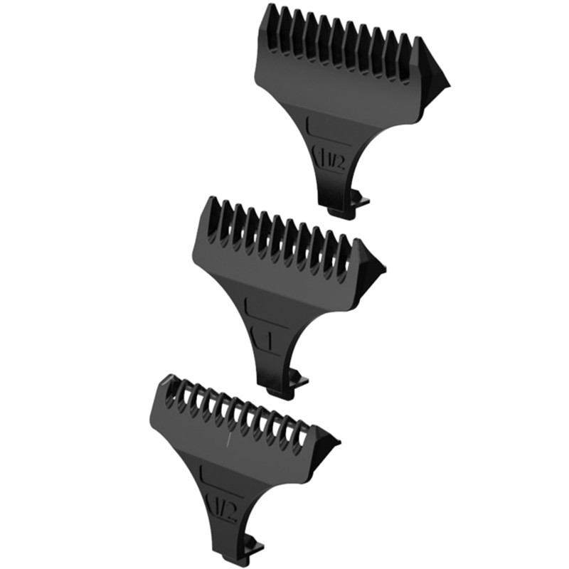 Аксессуары в комплекте: 3 гребня, дополнительное Т-образное лезвие, база для зарядки, USB шнур для зарядки, защита лезвия, масло для смазки, щеточка для очистки.